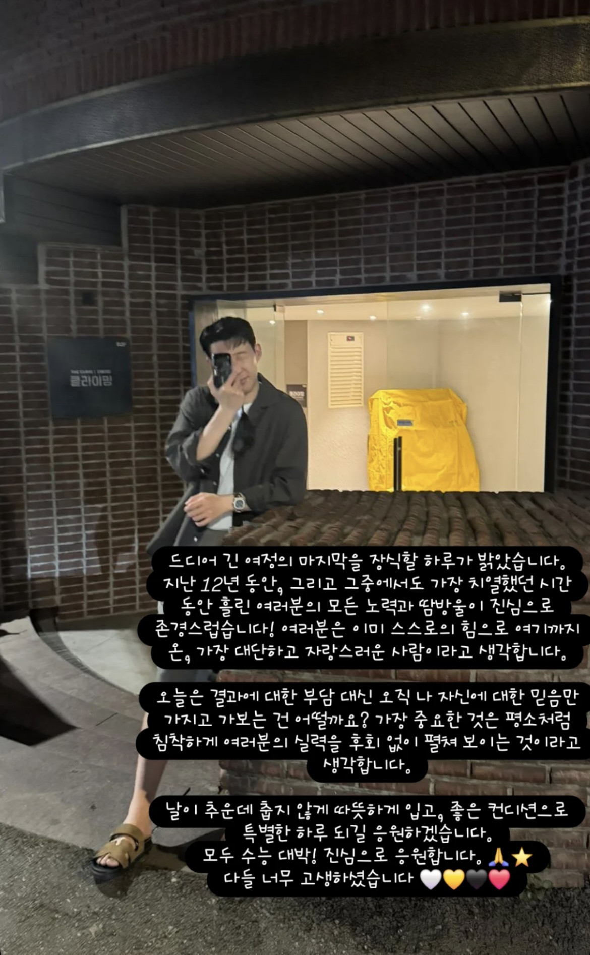수험생 응원글을 남긴 손흥민[손흥민 인스타그램 캡처][손흥민 인스타그램 캡처] 우리나라 축구대표팀의 손흥민이 2026학년도 대학수학능력시험을 치르는 수험생들에게 응원을 남겼습니다. 손흥민은 수능 당일인 오늘(13일) 자신의 인스타그램 스토리에 \"드디어 긴 여정의 마지막을 장식할 하루가 밝았다. 지난 12년 동안, 그리고 그중에서도 가장 치열했던 시간 동안 여러분의 모든 노력과 땀방울이 진심으로 존경스럽다\"고 수험생 응원 메시지를 올렸습니다... 현황